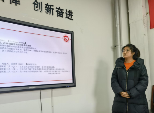 王婉婷老师首先进行报告,题目为:环境规制的涵义、绿色经济后果及研究展望。汇报的内容主要包括:环境规制的涵义与分类,环境规制及其组合的绿色创新、绿色增长、绿色全要素生产率和全要素碳生产率等绿色经济后果,并对环境规制的相关绿色研究进行了总结与展望。王老师汇报结束后,学院师生就研究问题的聚焦性、空间溢出效应和因变量如何选择等方面对报告内容进行了点评与讨论。
