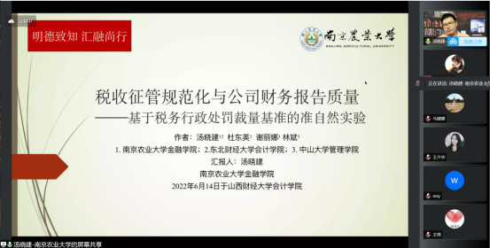 举行了第157次学术论坛,由南京农业大学汤晓健博士做学术报告:税收征管规范化与公司财务报告质量。