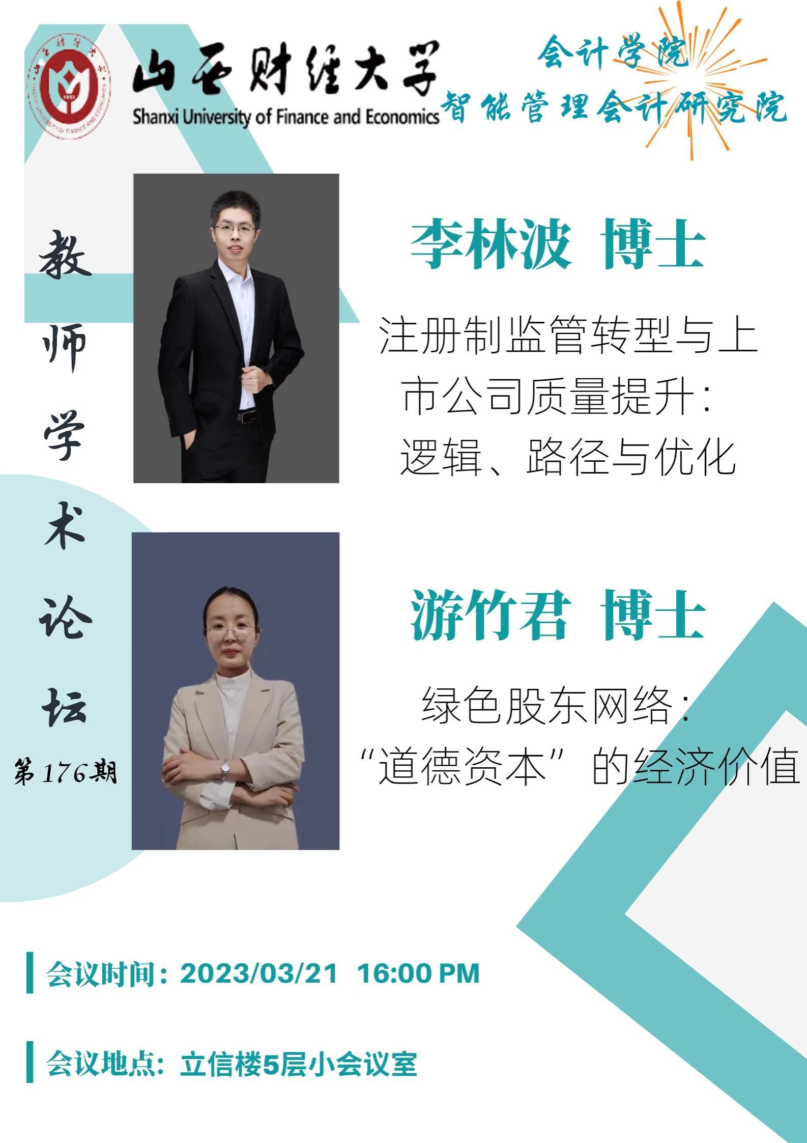 与智能管理会计研究院联合举行了第176次学术论坛。分别由李林波和游竹君两位老师汇报国家项目申报书的准备情况。李林波老师从研究背景、研究内容、文献综述、应用价值和理论机制、研究思路、研究重点和难点、创新之处以及研究方法等方面汇报了国家社科项目申请书的撰写情况;之后,王晓亮、续慧泓、游竹君、郝盼盼、贺亚楠、吴秋生、王瑶、董屹、焦然、李颖老师就题目表述、理论机制、指标衡量、模型设定、函数关系、研究方法、研究思路等方面提出修改意见。游竹君老师主要从选题背景、研究价值、研究内容、研究方法等方面汇报了国家项目申请书的撰写情况;之后王晓亮、郝盼盼、贺亚楠、吴秋生、李格、王瑶、焦然、李颖老师就研究问题表述、研究内容、变量定义等方面提出修改意见。本次学术研讨会由智能管理会计研究院副院长李颖老师组织并主持。本次论坛的召开有助于两院教师2023年国家项目申请书的进一步完善,也有助于两院师生了解学术前沿和实践领域的新动态。