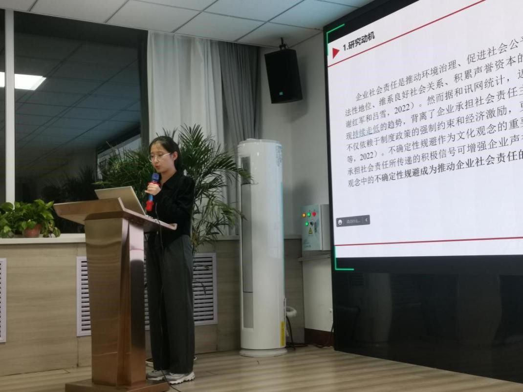 工商管理学院牛晓媛硕士生汇报了工作论文《文化观念与企业社会责任:基于不确定规避视角》。