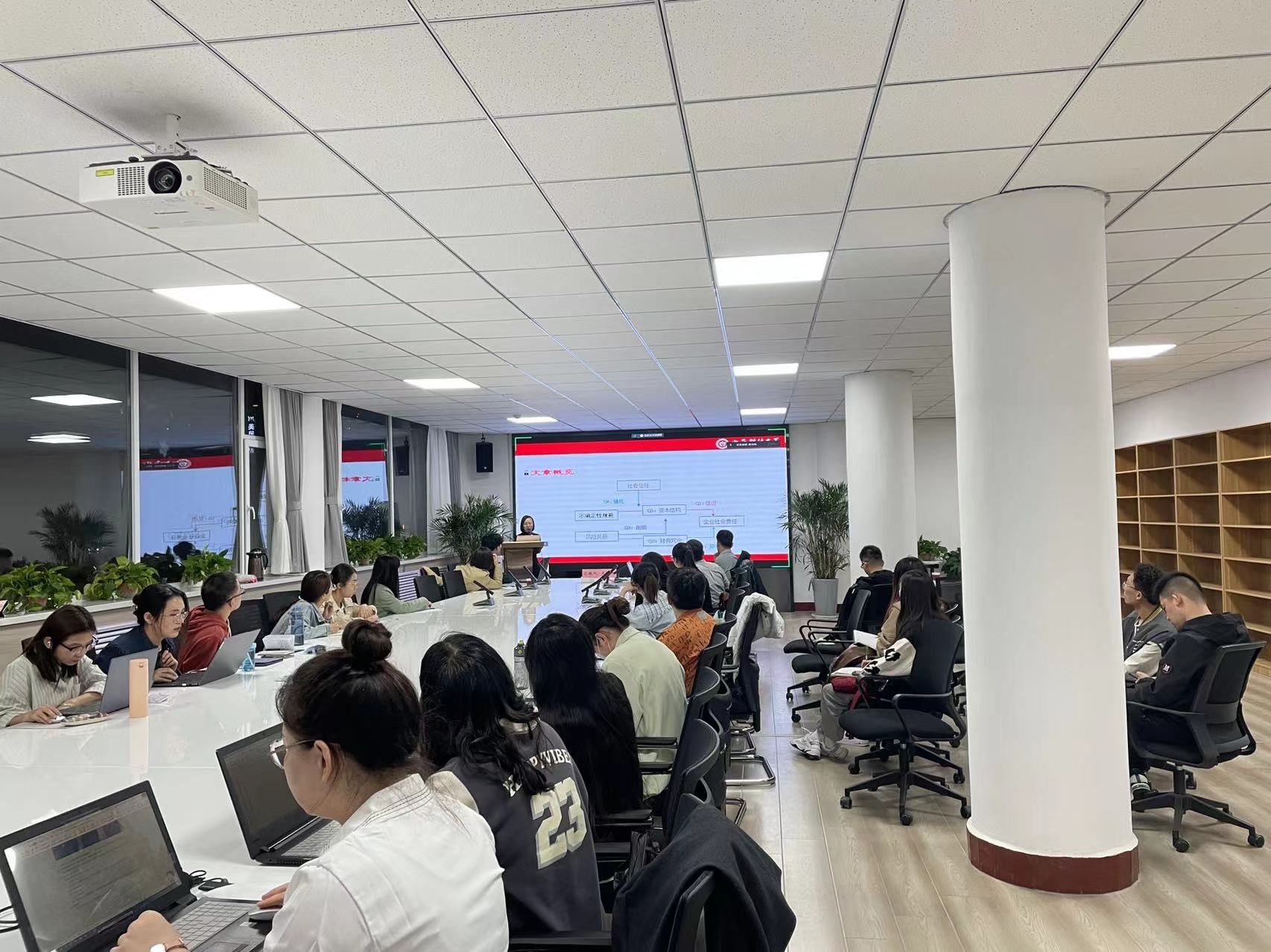 在专题报告环节,邢红卫副教授从生活中大众更愿意挑选带6和8的车牌号、不愿意买18楼和杭州“凶宅”拍卖的案例引入,进行以文化与金融决策为主题的讲座。讲座以主要从以下三方面进行探讨:文化与家庭金融决策、文化与分析师报告、文化与企业投资决策。文化与家庭金融决策方面,邢老师从种族、语言和儒家观念三方面进行分析;文化与分析师报告方面,从文化属性之间的认同角度切入,以文化认同——信任偏差——预测报告——市场反馈路径阐述;企业的文化与投资决策从两个维度考虑:风险承担和测量董事会或管理层文化多样性,每个维度又细分了许多方面讨论。讲座精彩纷呈,对文化的构建引发了在场师生的热烈探讨,启发了大家对文化刻画、文化与本专业选题融合等后续研究问题的思考。
