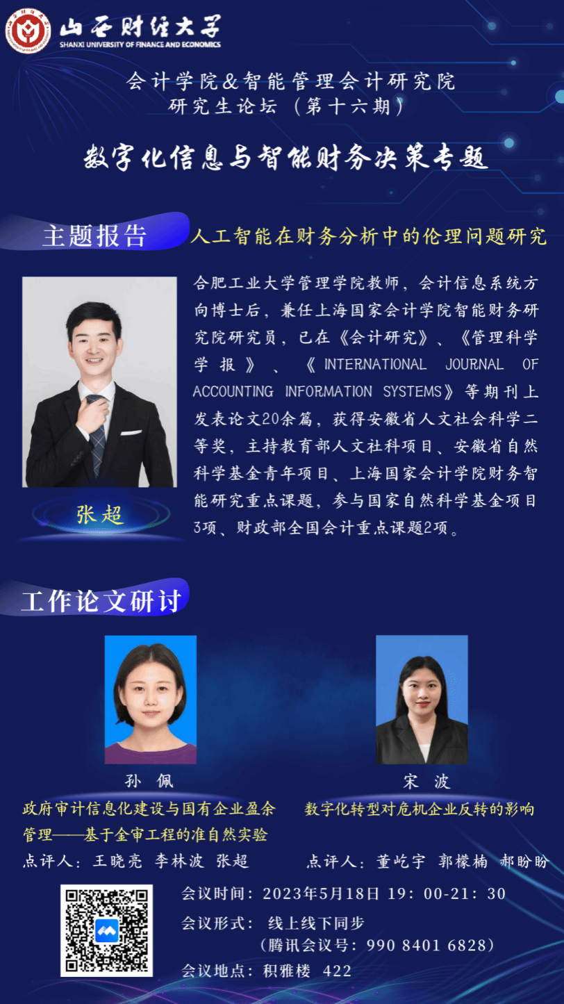 与智能管理会计研究院联合举办了研究生论坛(第十六期)。本次论坛的主题为“数字化信息与智能财务决策”,采取线下与线上同步的方式。轮值主持人为四虎影院