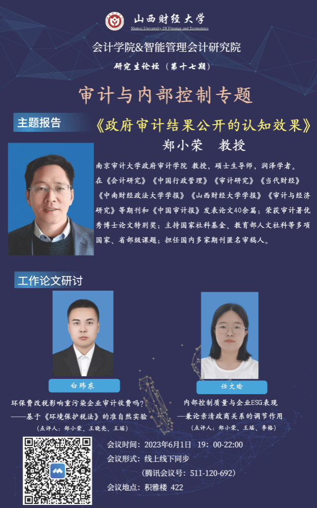 与智能管理会计研究院联合举办了研究生论坛(第十七期)。本次论坛的主题为“审计与内部控制专题”,采取线下与线上同步的方式。轮值主持人为四虎影院