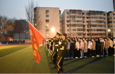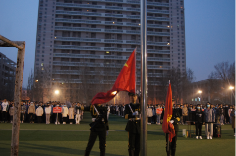 黎明前的夜色中,同学们站立整齐,注视国旗护卫队迈着庄严而整齐的步伐行至旗台。伴随着庄严嘹亮的国歌,五星红旗冉冉升起,迎泽校区全体师生怀着崇敬与喜悦的心情,凝视着迎风飘扬的五星红旗,心中无比自豪。